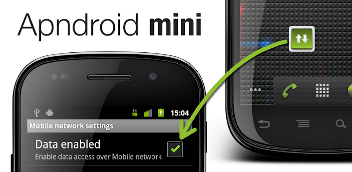 Apndroid mini is desktop widget that toggles your phone's 'Data enabled' settings. It disables data access over Mobile network to help you to save money and battery with one click on your home screen. This is widget, to install, long press the home screen and choose Widget > APNdroid mini.