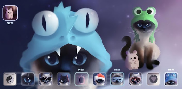 If kitty feels down you can comfort him, he purrs and meows. Change themes from snowy to fireflies and customize siamese cat in many ways! Lots of options and accessories - hats, glasses, necklaces and other details to change and combine. All art is original and handpainted!